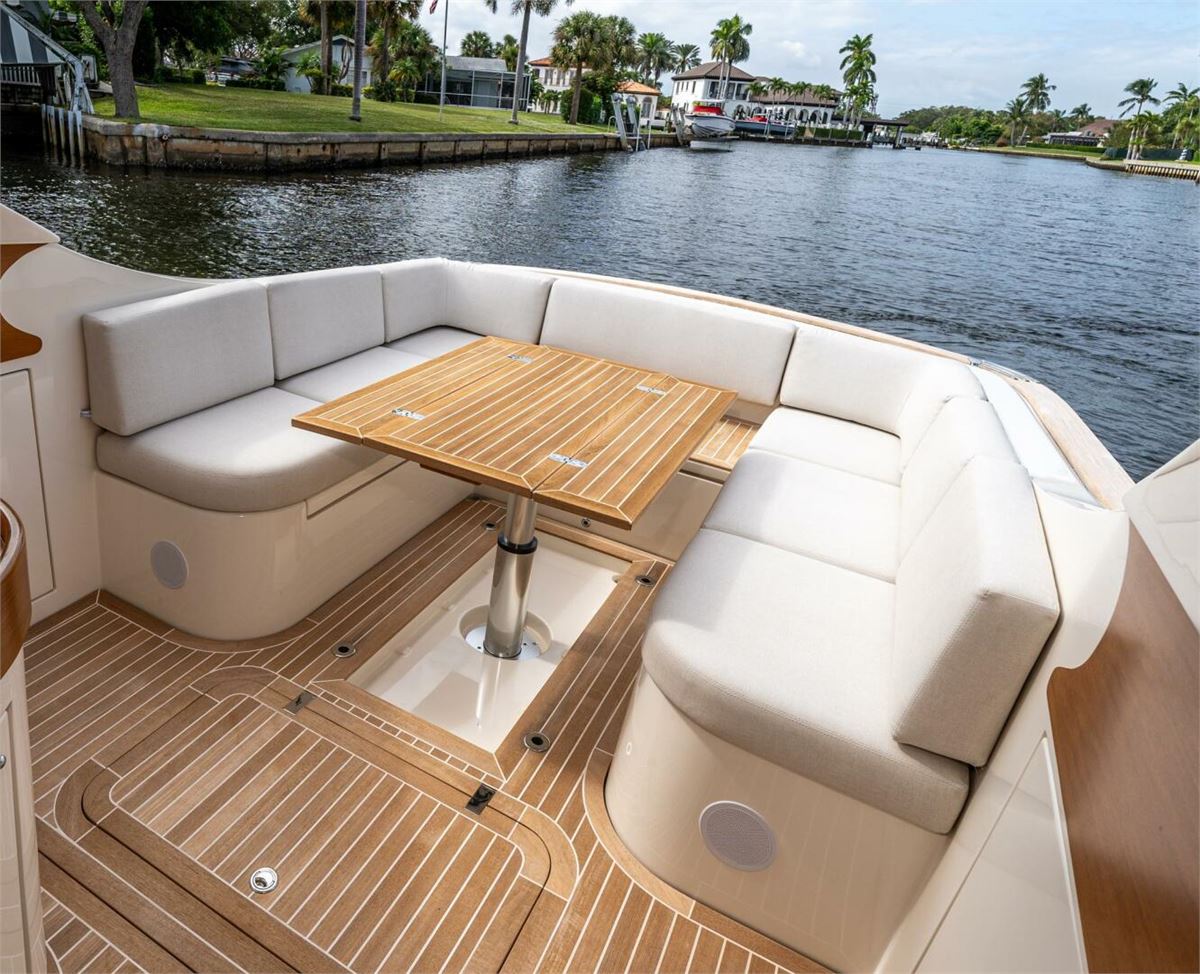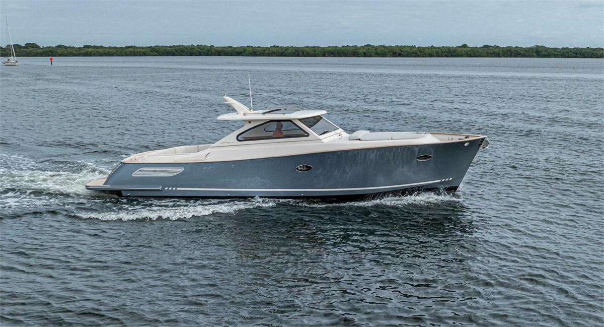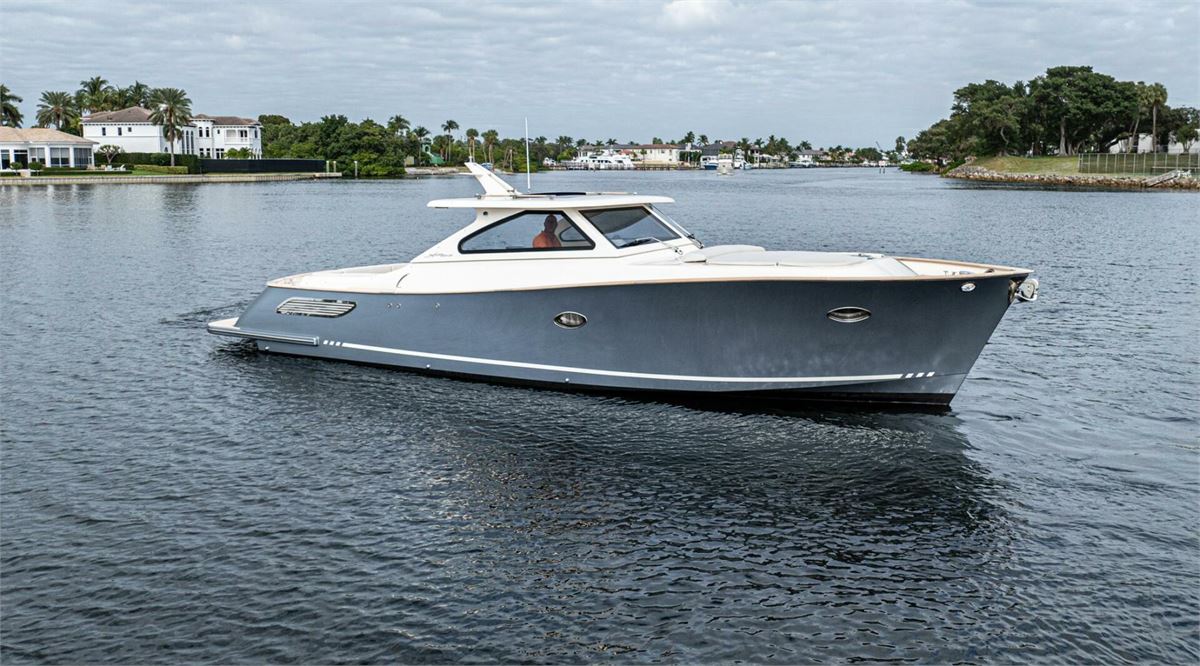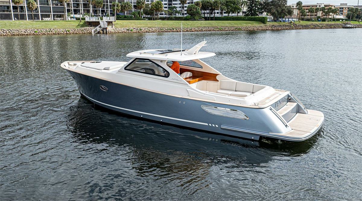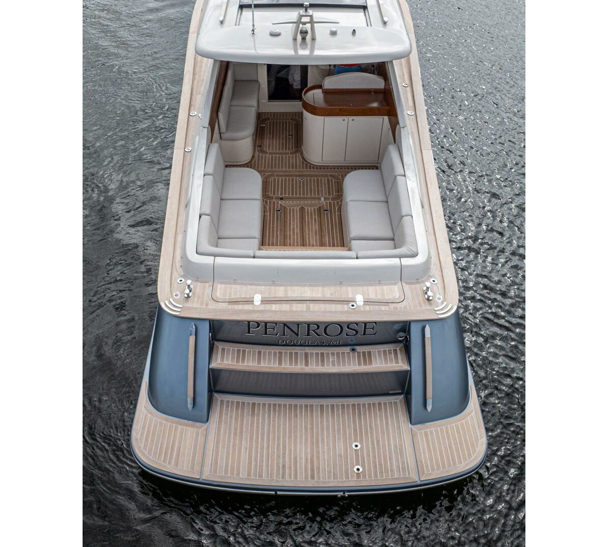We are pleased to introduce PENROSE, a Lobster 35 built by Cantieri Gagliotta. Powered by Mercury diesels rated at 270 hp each, PENROSE cruises at 26 kts and has a range of around 250 miles. Her deep V hull design and SeaKeeper 2 ensure a smooth, dry ride while lounging in a choice of multiple areas aboard. An upholstered tanning area is on the bow or a U-shaped seating area is found aft in the cockpit, where a convertible table can covert the seating to a flush lounging surface. The outdoor galley is close by, behind the helm seating, and well-appointed, air-conditioned sleeping accommodations and a full head are forward. Penrose is the perfect platform for relaxation and luxurious entertaining on the water.